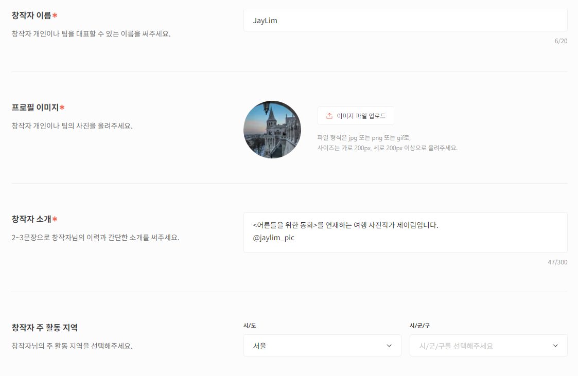 1) 창작자 이름 2) 프로필 이미지 3) 창작자 소개 4) 주활동지역