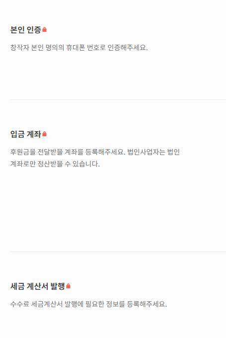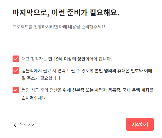 세 사이트를 비교하면서 느낀 점이 텀블벅이 가장 레이아웃이 깔끔하고 서류도 간단하다.