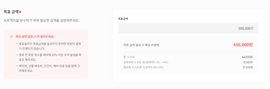 1) 목표금액 (최소 50만원, 수수료 8%)) 2) 펀딩일정
