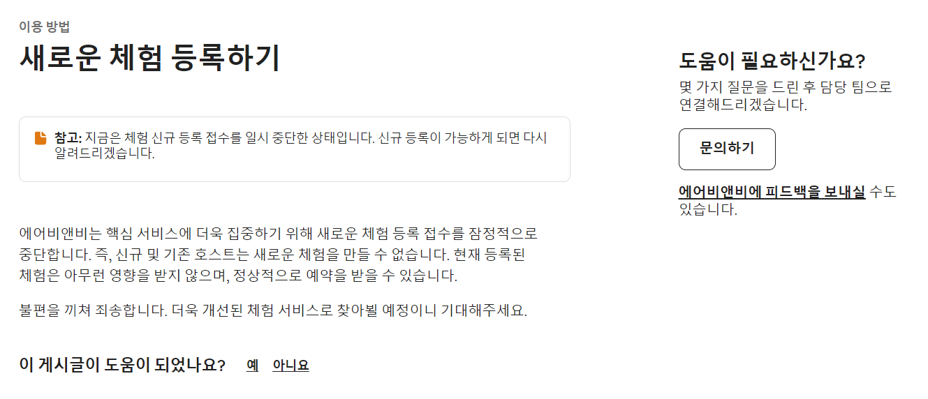 현재 에어비앤비는 체험 호스팅이 중단되었다.