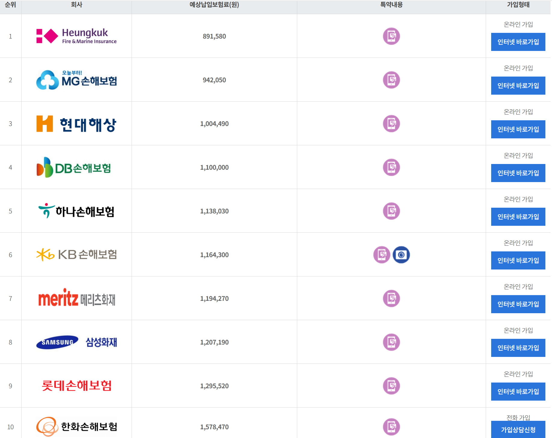 통합 사이트에서 비교해보고 1~5위까지만 상세 사이트 보험 조회 예정 (실제는 다르다고 함)