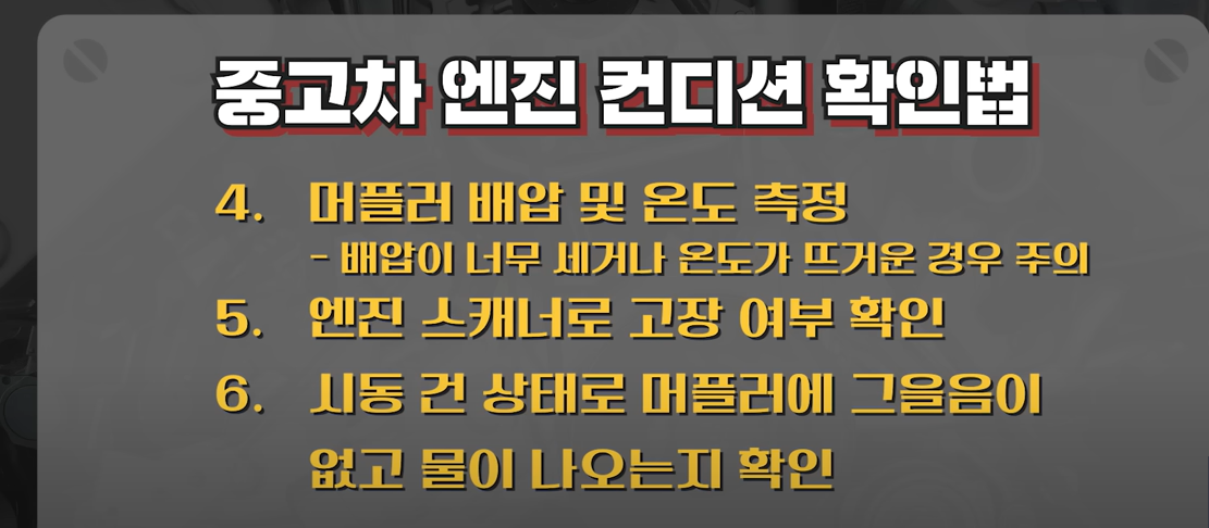 - 배기가스 확인, 머플러 (물이 나옴-연비 좋음, 손 집어 넣었을 때 까만색이면 배기가스 후처리, 연료 분사 문제)