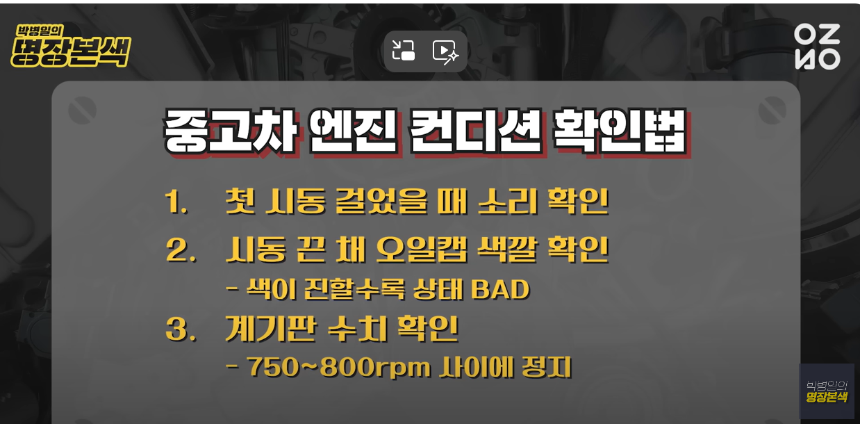 - 시동 끈 채 엔진오일(금색 은색 옅은 갈색 OK, 진한 갈색 나쁜 거), 계기판 750~800이 적당 (오르락내리락 엔진 부조)